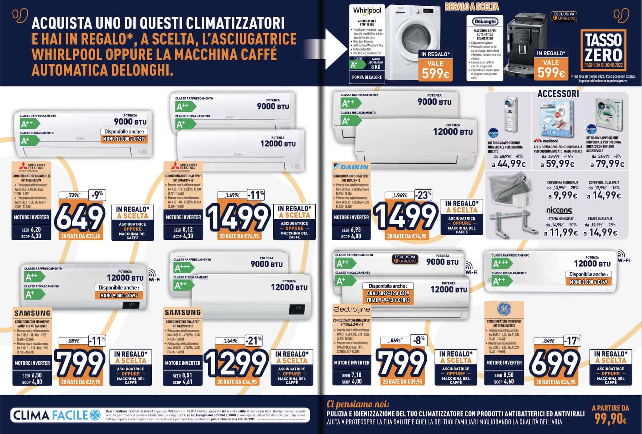 Un’altra sezione del Fuoritutto Unieuro 2022 è dedicata ai climatizzatori, che vengono proposti in vendita abbinata con una macchina del caffè o con un’asciugatrice.