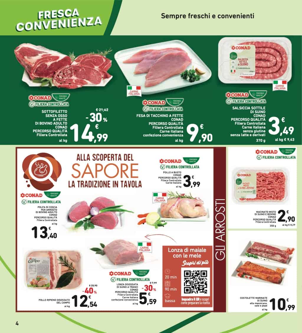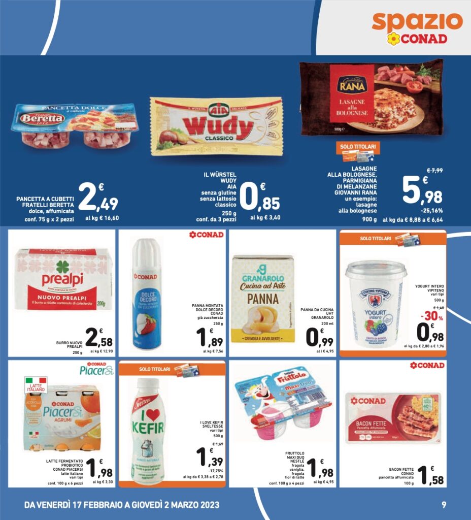 In effetti il volantino Conad dal 17 febbraio 2023 si apre con frutta, carne e formaggio, e anche le prime (5) pagine interne sono di questo tenore.