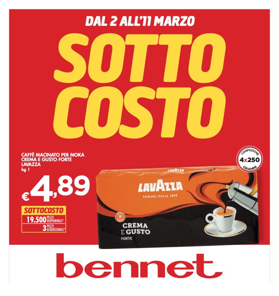 Caso originale quello del caffè Lavazza: da Bennet sottocosto nella versione “Crema e gusto forte” mentre Iper fa il Qualità rossa ed Esselunga il Crema e gusto “classico”, ma sempre lì siamo.