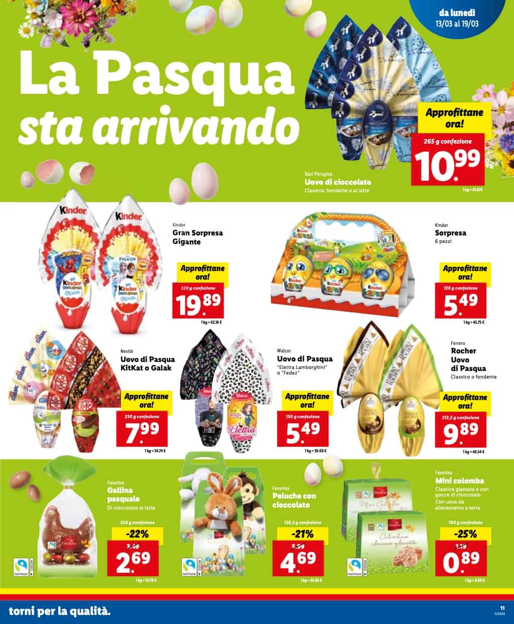 Ma ci sono uova di Pasqua anche per i più grandi nel volantino Lidl dal 13 marzo 2023, per esempio quello di Ferrero Rocher, di Baci Perugina e l’uovo Deluxe Lidl di cioccolato bianco con granello di pistacchio e mandorla (e l’acquisto di quest’ultimo consente anche di partecipare al concorso Lidl di Pasqua di cui abbiamo parlato a parte).