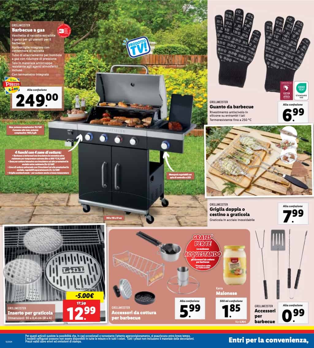 L’altro prodotto che quando compare a volantino crea sempre un certo hype è il barbecue a gas Grillmeister, che è un po’ la Ferrari della sua particolare nicchia con 4 fuochi e 4 zone di cottura, bruciatore in ceramica fino a 800 °C, scaldavivande per le cotture a basse temperature e tutta una serie di accessori che completano l’offerta e risolvono ampiamente il discorso della griglia per chi ancora non l’ha ma vorrebbe farsene una.